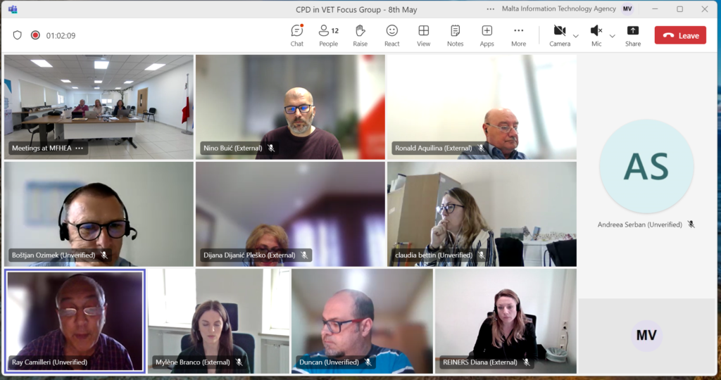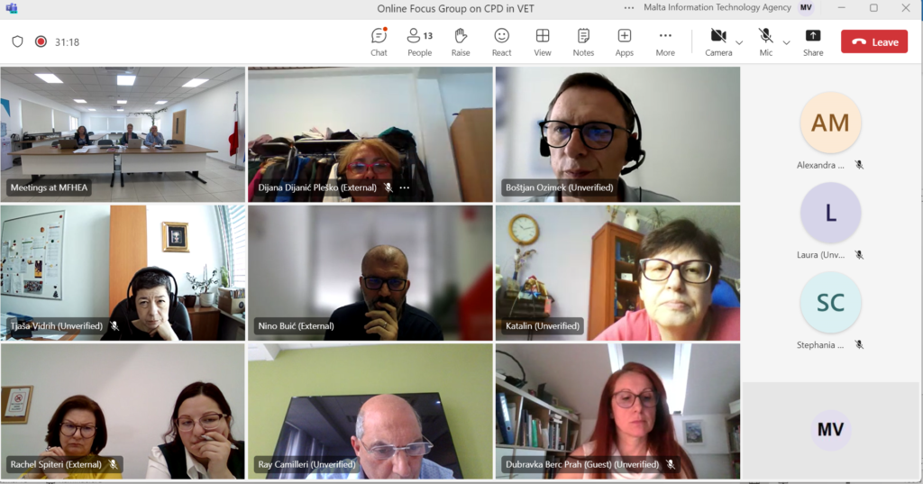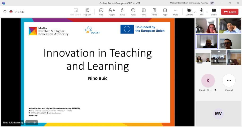 The MFHEA conducted an online focus group session as part of the CPD in Vocational Education and Training Quality Assurance (EQAVET 2023) project. The session was held on 15th April and led by two experts Gino Schiavone and Nino Buić. Thirteen experts from various countries took part in discussions on strategy, policies and procedures, maintenance and continuous improvement of the quality assurance system in VET institutions and innovation in teaching and learning.