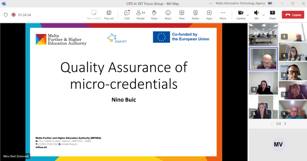 The MFHEA hosted the third and final focus group session as part of the CPD in Vocational Education and Training Quality Assurance (EQAVET 2023) project on 8th May. The session was led by experts Gino Schiavone and Nino Buić. The session brought together specialists from various countries to discuss strategy, policies and procedures, quality assurance of work-based learning, and quality assurance of micro-credentials.